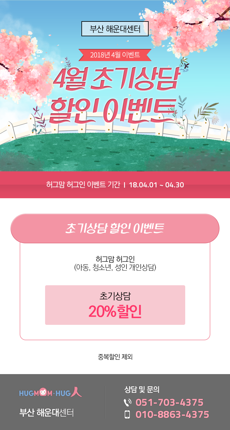 부산해운대센터 │4월 초기상담 할인이벤트 2018.03.30 조회:18007 |