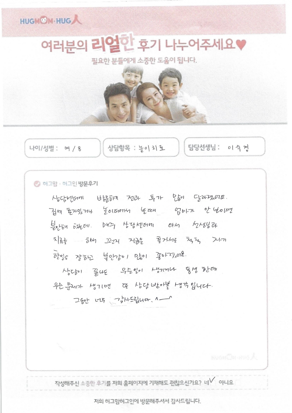 - 상담항목 : 놀이치료 - 담당선생님 : 이숙경 상담센터에 방문하기 전과 후가 많이 달라졌어요. 집에 혼자있거나 놀이터에서 놀때 엄마가 안 보이면 불안해 하는데 매주 상담센터에 와서 선생님과 치료를 해서 그런지 지금은 혼자서도 척척 자기 할일도 잘하고불안감이 많이 좋아졌어요 상담이 끝나도 무슨일이 생기거나 동생한테 무슨 문제가 생기면 또 상담 받아 볼 예정입니다. 그동안 너무 감사했습니다 ^^ |