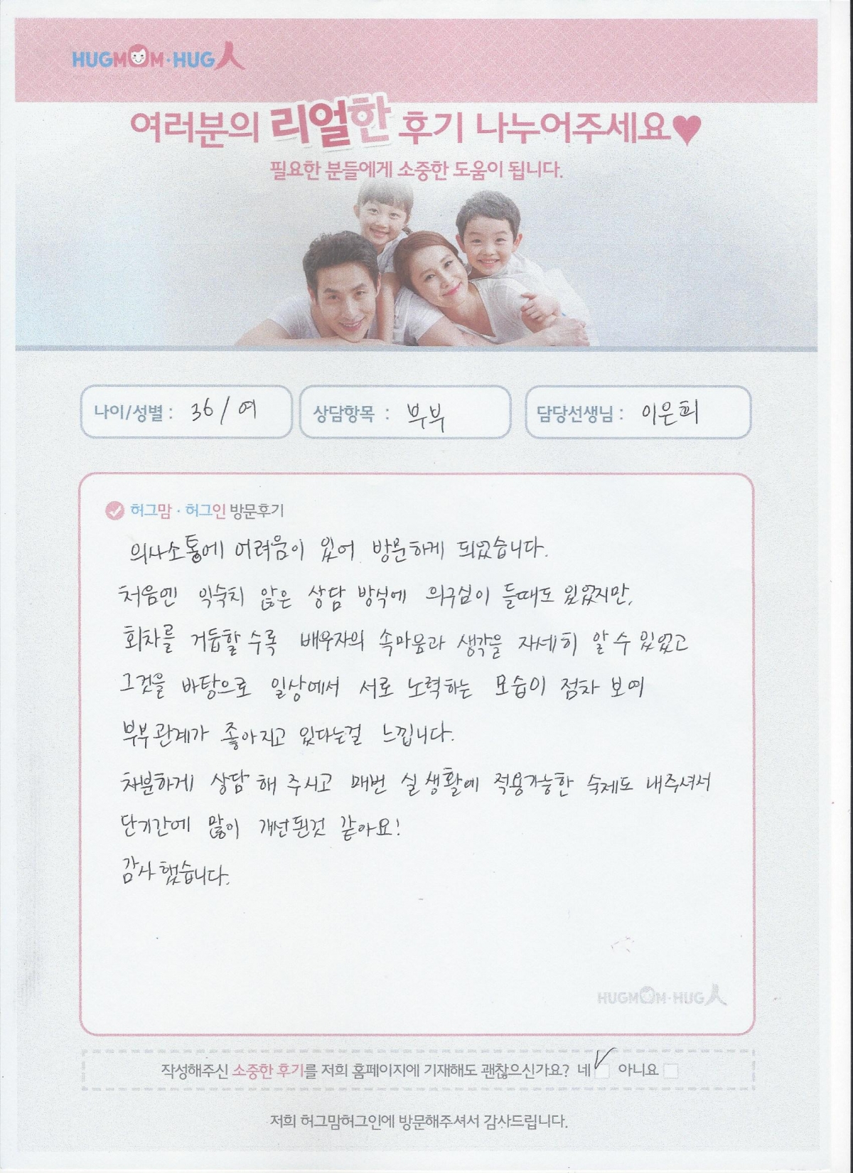 * 나이/성별 : 36/여 * 상담항목 : 부부 * 담당선생님 : 이은희 선생님