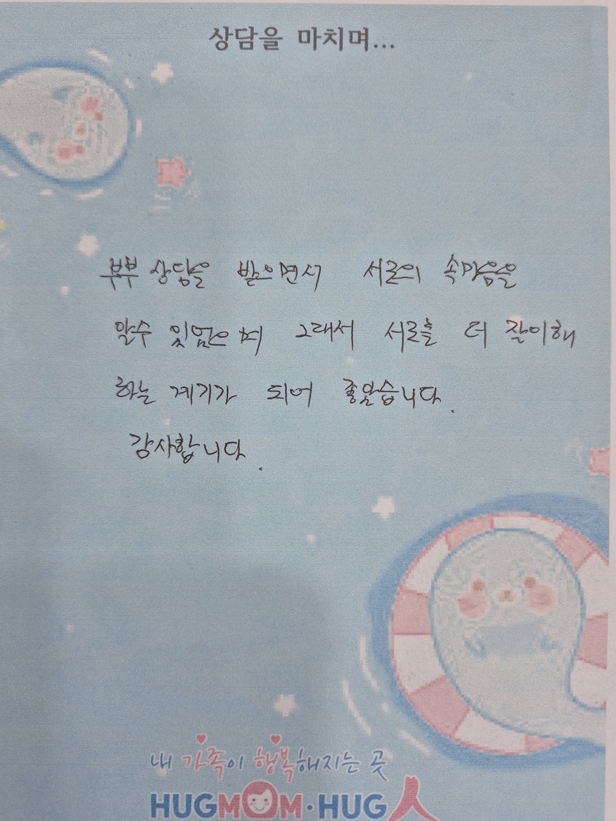 [부산해운대센터] (156)부부상담 후기입니다 허그맘허그인해운대점 2026.02.20 조회:2324 |