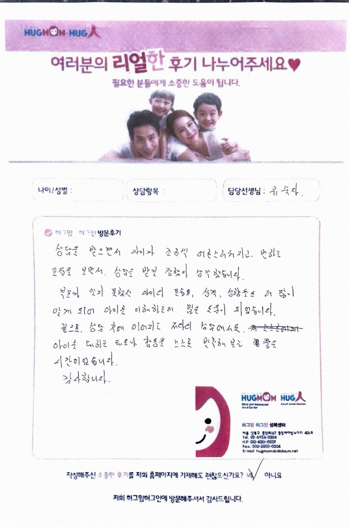 [성북센터] [허그맘허그인 성북센터] 유숙자 선생님 짝치료 내담자 친필 후기